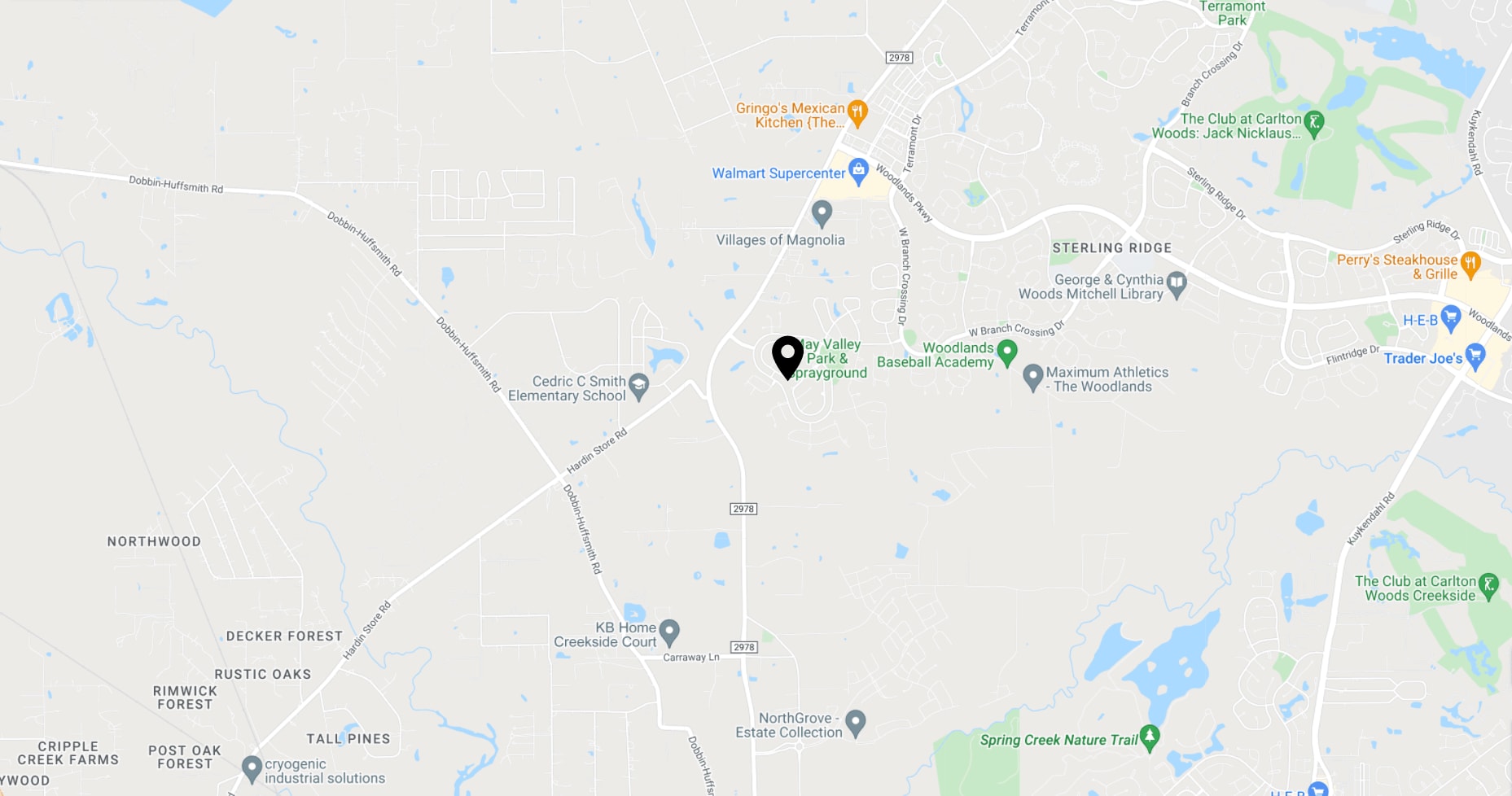 May Valley is located in The Woodlands, near FM 2978 and Woodlands Parkway, within the Village of Sterling Ridge. May Valley Park offers tennis courts, basketball courts, play equipment, a large covered pavilion, and a fun children’s splashpad! Numerous walking and biking trails connect May Valley to the other villages & amenities in The Woodlands. Ideally situated near shopping, restaurants, and conveniences at Terramont Village Shopping Center, where you can find a Walmart Supercenter, Starbucks, hair & nail salons, fast-food restaurants, bakeries, banks, and gas stations. A local favorite, The Republic Grille, opened its the second location here, offering an eclectic Texas Hill Country atmosphere, mouth-watering cuisine, and spacious outdoor patio. May Valley is zoned to highly-rated Magnolia Independent School District public schools. There are also multiple private schools to choose from in The Woodlands.
